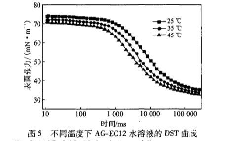 由圖5可知,當(dāng)溫度升高,DST下降的速率明顯加快。這是因?yàn)榉肿拥牟灰?guī)則運(yùn)動(dòng)更加激烈,使得分子間的引力減小。表面張力越早開(kāi)始下降,在各個(gè)階段的表面張力值就越低。在45℃下開(kāi)始測(cè)量時(shí),表面張力已經(jīng)降到了70mN/m左右,這也許是由于溫度升高降低了純?nèi)軇┧谋砻鎻埩ΑI邷囟龋砻鎻埩ο陆档母欤走_(dá)到第四個(gè)階段平衡狀態(tài)。這說(shuō)明了高溫下其動(dòng)態(tài)表面活性更好。可能是由于表面活化能在高溫時(shí)更低,使得AG.EC分子更易在溶液表面吸附。