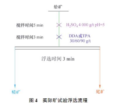 在XFG掛槽浮選機上進行實際礦浮選試驗,轉速設為1 992 r/min。每次稱取250.0 g礦樣放入0.5 L浮選槽中,加入0.3 L自來水;綜合考量文獻調研、純礦物浮選結果、經濟性等方面因素,確定礦漿pH值等于5為較佳的浮選pH條件。使用H?SO?作為pH調整劑,調節礦漿pH值為5,攪拌礦漿5 min后,加入一定量的DDA或TPA,攪拌3 min后開始用刮板刮出泡沫產品,每間隔3 s刮1次,浮選刮泡時間為3 min。結束后將得到的泡沫產品和槽內產品分別烘干、稱量,測定品位,并計算產率與回收率。實際礦浮選試驗流程如圖4所示。