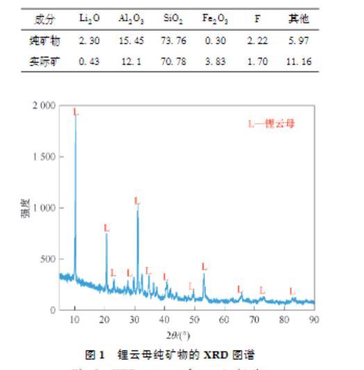 試驗所用鋰云母純礦物為購買的高純度礦塊,實際礦試驗所用鋰云母礦取自江西崇義,經破碎、磨礦、篩分等流程,得到粒級為(-0.074+0.045)mm的浮選試驗礦樣。鋰云母純礦物及實際礦多元素分析見表1,純礦物的XRD圖譜如圖1所示,可看出無明顯雜質峰?;瘜W元素分析表明鋰云母純礦物含2.30%的Li?O,符合純礦物浮選要求。實際礦浮選試驗礦樣含0.43%的Li?O,屬于低品位難選鋰云母礦。