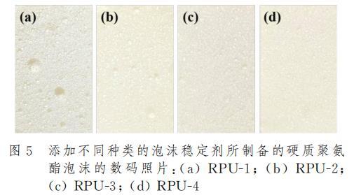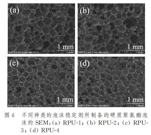 泡沫穩(wěn)定劑的存在對于硬質聚氨酯泡沫性能影響在宏觀上有著十分顯著的體現(xiàn)。圖5是添加不同種類的泡沫穩(wěn)定劑后制樣得到的硬質聚氨酯泡沫橫截面的數(shù)碼照片。結果表明,接枝APEG鏈段的PAVE-5和PGVF-6泡沫穩(wěn)定劑所制備的聚氨酯泡沫RPU-3和RPU-4,其泡孔結構相較于市售產(chǎn)品所制備的聚氨酯泡沫展現(xiàn)出了更加細膩均勻的泡孔結構,而市售產(chǎn)品所形成的泡沫則表現(xiàn)出較為粗糙且孔徑不均勻的泡孔結構。這表明親水結構有利于泡沫穩(wěn)定劑均勻分散在多元醇中并使得反應充分進行,泡孔尺寸細小致密,有利于改善硬質聚氨酯泡沫的壓縮性能。