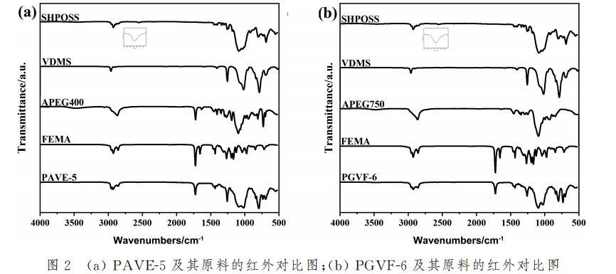 通過紅外光譜對所制得功能材料的官能團化學狀態(tài)進行表征分析,圖2(a)和2(b)分別為PAVE-5和PGVF-6及其原料的紅外吸收光譜圖。PAVE-5和PGVF-6譜圖中,能夠清晰觀察到處于2960cm-位置的CH3反對稱伸縮吸收峰,處于2930和2860cm-1的CH2伸縮吸收峰,處于1720cm-位置的酯基C=O伸縮吸收峰,處于1256cm-1位置的C-O-C伸縮吸收峰,和處于1090和1010cm-位置的Si-O-Si吸收峰,而原本SH-POSS處的S-H吸收峰消失,VDMS、APEG400、APEG750和2-壬烯酸甲酯的單體C=C伸縮吸收峰也消失,表明PAVE-5和PGVF-6制備成功。