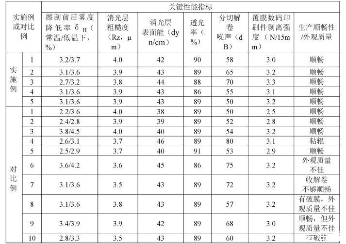 從實施例1~實施例5的數(shù)據(jù)可知,本發(fā)明的耐擦刮無膠消光膜在常溫和低溫環(huán)境下均具有良好的耐擦刮性能,實現(xiàn)了消光層表面在耐擦刮性、高表面張力(與印刷適性正相關)與收解卷順暢性的平衡。其中實施例4中球體抗粘連劑為球體聚硅氧烷,雖然制得的薄膜的透光率相比實施例2有所下降,但是薄膜的分切解卷噪聲降低明顯,總體性能是符合本申請要達到的目標的。實施例5中,在熱復合層中加入了適宜熔融指數(shù)的高密度聚乙烯,其制備的耐擦刮無膠消光膜表現(xiàn)出更低的分切解卷噪聲,解卷順暢性更好,且未對薄膜的透光率和熱復合層與印刷件之間的剝離強度產生不良影響。