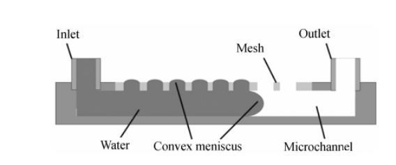 氣溶膠到水溶膠的采樣,一方面要求管道是開放的,以保證空氣中的生物質(zhì)能夠進入液體;另一方面為了避免液體在流動過程中外泄,管道必須封閉。本文設(shè)計了一種開放的管道,其頂部開放面覆蓋有疏水柵網(wǎng),如圖1所示。疏水柵網(wǎng)孔中的水在表面張力的作用下會形成一個彎月面,阻止水從柵網(wǎng)孔中流出。這樣空氣中的生物質(zhì)就能通過柵網(wǎng)孔進入管道,同時管道中的液體可以穩(wěn)定流動而不會外溢。
