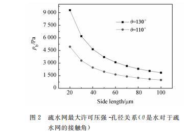 其中:sigma為液體表面張力,a為柵網(wǎng)方孔的邊長,theta為液體對于柵網(wǎng)的接觸角。計算中假設(shè)水溫為20^{circ}C,此時水的表面張力系數(shù)sigma=0.0728~N/m(后面計算中都采用此參數(shù))。最大許可壓強Pb和孔邊長的關(guān)系如圖2所示,可以看到采用疏水性好、網(wǎng)孔小的柵網(wǎng)可以得到更大的Pb。