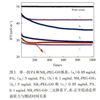 在25℃條件下,測得水和正辛烷之間的界面張力為50.7 mN/m(圖3),與之前研究中報道的界面張力值51.16 mN/m非常接近。為了研究PA與NH2-PEG-GO在共存時對界面張力的影響,分析了0.05 mg/mL PA、0.1 mg/mL NH2-PEG-GO各自對界面張力的影響。圖3顯示PA與NH2-PEG-GO均具有界面活性,能夠吸附到水-正辛烷界面上,降低界面張力。同時也觀察到:0.05 mg/mL PA降低界面張力速率快,平衡時間較短(<200 s),界面張力曲線呈現(xiàn)先快速下降后平衡的趨勢,而當0.1 mg/mL NH2-PEG-GO存在于溶液中時,界面張力降低速率較慢,大約在700 s后達到平衡。分析發(fā)現(xiàn),界面張力隨著時間的演變呈現(xiàn)先快速下降,后緩慢下降,最后平衡的特點,這表明接近吸附平衡時出現(xiàn)勢壘,減緩了粒子在界面上的進一步吸附。這種吸附勢壘由多種因素導致,通常與已吸附在界面上的分子所產(chǎn)生的表面壓以及隨著界面密度提高,分子取向的改變相關。同時在吸附后期,可供吸附的界面面積減少,已經(jīng)吸附到界面上的粒子必須重新排列以空出足夠的空間供額外的粒子進行吸附。這種重排的速率是由粒子的面內(nèi)遷移率決定的,即粒子在界面上的擴散系數(shù)。該擴散系數(shù)通常要小于粒子在本體中的擴散系數(shù),并與粒子尺寸、粒子表面配體修飾等相關。