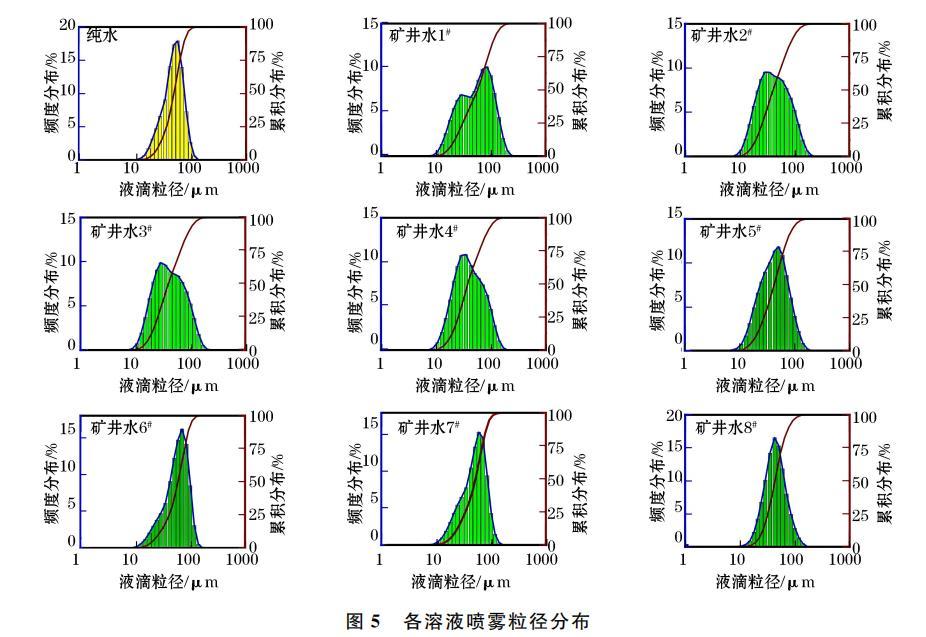 噴霧降塵效果與霧化特性參數(shù)密切相關(guān),其中霧滴粒徑是影響霧化特性的關(guān)鍵因素。9組溶液在15cm測點處的粒徑分布如圖5所示。由圖5可知,各溶液霧滴粒徑主要分布為25~75μm,純水、礦井水1#至4#和礦井水5#至8#噴霧粒徑位于該區(qū)間的平均比例分別為80.10%、55.87%、69.73%,礦井水1至8#的粒徑累積分布曲線斜率逐漸增加,這說明礦井水霧化效果不斷提升。由此可知,礦井水中Na+、K+離子濃度越低,霧滴粒徑分布越集中,其霧場更有利于呼吸性粉塵捕集。這是由于礦井水表面張力減小,霧滴破碎程度逐漸提高,致使霧滴細化且粒徑集中分布于25~75μm區(qū)間,這說明噴霧霧化特性隨表面張力減小不斷優(yōu)化,霧滴粒徑趨向均勻分布。綜上,礦井水中Na+、K+離子濃度差異改變其表面張力,從而影響噴霧粒徑分布、霧化百分比等特性。