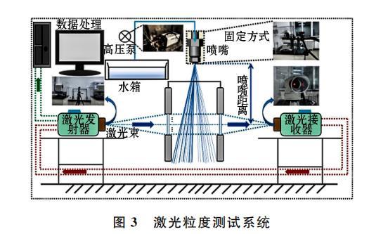 從圖3可知,噴霧粒徑測試主要儀器及工具包括激光粒度分析儀、高壓噴霧水泵、計算機分析控制系統(tǒng)等。計算機分析控制系統(tǒng)使用PAQXOS 4.1測量軟件,該軟件可定義、控制整個測量過程,并在試驗結(jié)束后處理測量的粒度分布數(shù)據(jù)。
