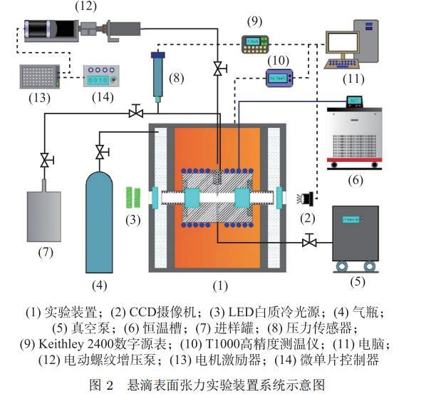 本文所搭建的懸滴法表面張力實(shí)驗(yàn)系統(tǒng)的溫度和壓力適用范圍為 223.15 ~ 373.15 K 和 0 ~ 15 MPa。實(shí)驗(yàn)系統(tǒng)示意圖如圖 2 所示,其主要包括實(shí)驗(yàn)裝置本體、恒溫槽、溫度控制與測量系統(tǒng)、氣體增壓與壓力測量系統(tǒng)、液滴控制系統(tǒng)、真空系統(tǒng)、圖像采集和數(shù)據(jù)處理系統(tǒng)。