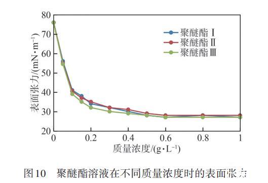在室溫下,將聚醚酯配制成不同質量濃度的水溶液,測試其表面張力,結果見圖10。由圖10可知,聚醚酯溶液的表面張力隨其質量濃度的增高而下降,當聚醚酯溶液的質量濃度為0~0.2 g/L時,聚醚酯溶液的表面張力下降較快,當聚醚酯溶液的質量濃度大于0.2 g/L時,聚醚酯溶液的表面張力隨其質量濃度的增加而下降較慢,3種官能度聚醚酯的表面張力下降趨勢基本一致,當聚醚酯溶液的質量濃度提高到0.6 g/L時,3種聚醚酯溶液的表面張力均降至27.0 mN/m,說明聚醚酯在較低的質量濃度下可以快速降低表面張力,表面性能優異。