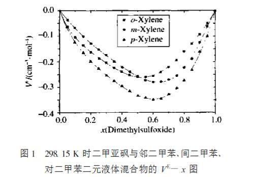從圖1 可以看出,在298.15 K 時,二甲亞砜+鄰二甲苯、二甲亞砜+間二甲苯、二甲亞砜+對二甲苯共3 個二元混合物在全濃度范圍內(nèi)過量體積為負值,在最小值處大小順序為:鄰二甲苯>間二甲苯>對二甲苯。二甲亞砜是極性分子,存在 SO基團,是電子的受體;二甲苯分子中存在著大 π鍵,是電子授體,電子受體與電子授體之間形成 n -π配鍵,屬于弱化學作用,從而使他們組成的混合物體積收縮,過量體積呈現(xiàn)負偏差。