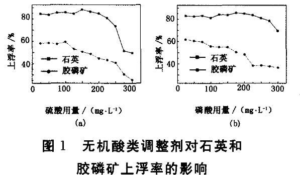 硫酸和磷酸是較為有效的膠磷礦抑制劑,工業應用廣泛。考察傳統調整劑對石英和膠磷礦可浮性的影響,結果見圖1。