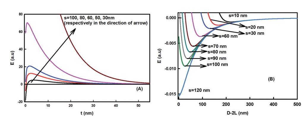 圖6足跡直徑對粘粒組件的影響。(A) 作為界面區(qū)域厚度函數(shù)的能量變化(L?60 nm,T?298 K,f?0.5,姜黃素納米顆粒半徑R?50 nm,疏水衰減長度x0?1 nm,界面張力?40 mN m-1)。(B) 粘粒–粘粒相互作用作為粒間分離D的函數(shù),使用方程(5)計算。對于更大的封裝外形直徑,能量最小值變得更深,對于大于100 nm的s,能量最小值變得更有吸引力。
