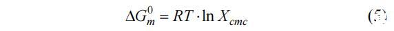 利用不同的熱力學方程計算了空氣/水界面以及膠束中的幾個熱力學參數。這些熱力學參數恰當地代表了系統的可行性。膠束化的標準吉伯自由能0 D Gm可由式(5)計算: