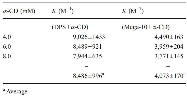 表1不同α-CD濃度下α-CD與DPS和Mega-10的1:1包合物的締合常數(Ka)值