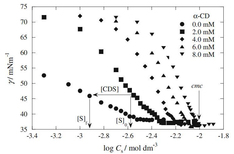 圖1顯示了2 mM Mega-10和DPS溶液的界面張力(γ)隨不同α-CD濃度的變化。兩種表面活性劑溶液的界面張力值均隨α-CD濃度的增加而增加。這種行為表明α-CD與Mega-10和DPS形成包合物,這些包合物沒有任何表面活性。在沒有α-CD的情況下,不同濃度的α-CD的界面張力對應于γ值,這證實了CD本身不具有表面活性(數據未顯示)。圖2顯示了Mega-10和DPS(αDPS=0.8)混合體系在不同α-CD濃度下的總表面活性劑濃度的γvs.log曲線。每條曲線顯示與cmc對應的斷點。在圖2中,由于α-CD中加入了表面活性劑單體,通過降低本體中的游離表面活性劑單體濃度延遲了膠束形成過程,因此每條曲線也移向更高的表面活性劑濃度。此外,cmc以上表面活性劑的γ值與α-CD濃度無關(圖2)。這表明表面活性劑與α-CD形成的包合物不參與界面吸附。在α-DPS=0.0、0.2、0.4、0.6和1.0時,在不存在和存在2-8mmα-CD濃度的情況下,獲得了類似的曲線圖(數據未顯示)。Mega-10和DPS的α-CD濃度依賴性cmc值如圖3所示。圖3清楚地顯示了cmc和α-CD濃度之間的線性關系。這一行為是表面活性劑和α-CDs之間形成包合物的另一個跡象,導致表觀cmc值增加。純Mega-10(5.75 mM)和DPS(2.57 mM)測定的cmc值與報告的文獻值一致[24–26]。