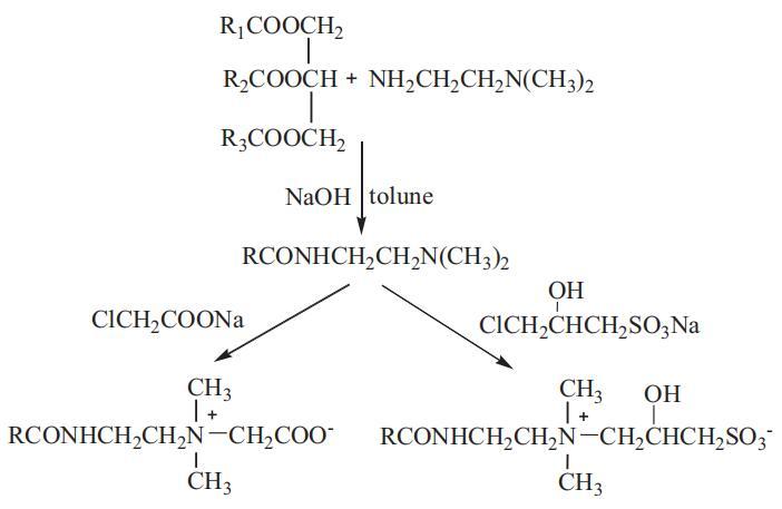 羧基甜菜堿和磺基甜菜堿表面活性劑OCB和OSB已通過兩步程序成功合成,如方案1所示。第一步是以DMAEA為中間體,從橄欖油的甘油三酯中分離出單甘酯,制備橄欖油酰胺(OA)。第二步是OA分別與氯乙酸鈉和CHPSNa進行季銨化。具體程序如下: