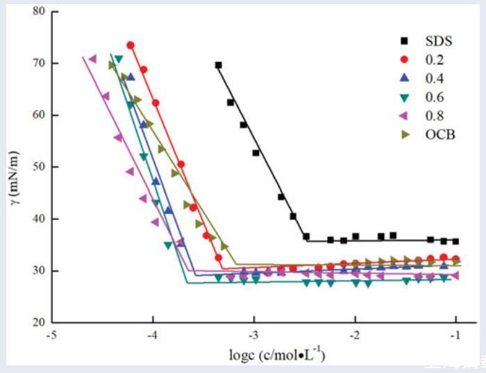 用表面張力法研究了橄欖油兩性表面活性劑(羧基甜菜堿OCB和磺基甜菜堿OSB)與陰離子表面活性劑十二烷基苯磺酸鈉(SDBS)在不同摩爾分數(shù)下的表面性質(zhì)。研究了無機鹽(NaCl、MgCl2)的加入對OCB/SDBS和OSB/SDBS體系表面活性的影響。結(jié)果表明,這兩種混合體系在所研究的所有摩爾分數(shù)上都比它們各自的組分具有更低的CMC值和更高的表面活性。同時,根據(jù)正規(guī)溶液理論,通過膠束相互作用參數(shù)(βm)確定了OCB/SDBS和OSB/SDBS之間明顯的協(xié)同作用。觀察到,αOCB=0.6時的OCB/SDBS混合體系和αOSB=0.6時的OSB/SDBS混合體系表現(xiàn)出最強的協(xié)同作用。此外,添加無機鹽后,二元表面活性劑混合物表現(xiàn)出更好的表面活性,并且無機鹽金屬離子的不同價態(tài)對混合體系的表面能力影響不同:Mg2+>Na+。