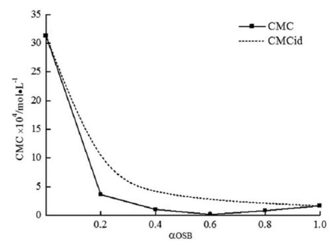 圖8。研究了實驗CMC、理想CMC與OSB摩爾分數(shù)的關系。