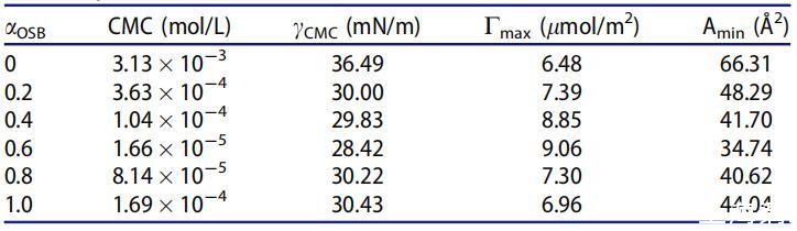 表4。25℃水溶液中不同摩爾分數(shù)(αOSB)OSB/SDS體系的表面性質(zhì)。