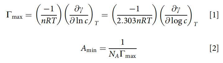 根據(jù)吉布斯吸附等溫線方程(方程1和2)[23]的近似形式計算最大表面過剩(Cmax)和最小表面積(Amin):