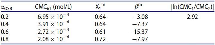 表5。25℃水溶液中不同摩爾分數(shù)(αOSB)OSB/SDS體系的非理想性及相互作用參數(shù)。