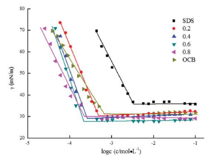 在25℃下測量了不同摩爾比的OCB、SDBS和OCB/SDBS混合體系的表面張力。OCB/SDB(αOCB)的比率從0.2,0.4,0.6更改為0.8,總摩爾濃度固定為0.1 mol/L。圖5說明了濃度與表面張力之間的關系,表2總結了表面張力參數(shù)。