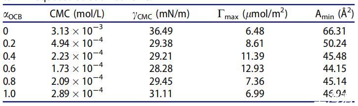 表2。OCB/SDS體系在25℃水溶液中不同摩爾分數(shù)(αOCB)的表面性質(zhì)。