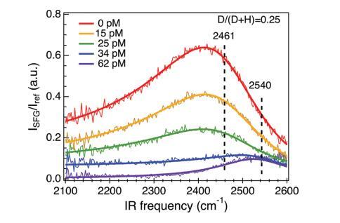 圖5。HOD在H2O中OD拉伸頻率窗口的光譜,給出了在diC14氨基單層下含有增加濃度DNA的磷酸鹽緩沖亞相。HOD的OD拉伸光譜只有一個單峰結(jié)構(gòu),并且清楚地表明,隨著DNA濃度的增加,共振振幅降低,共振向更高的頻率移動。