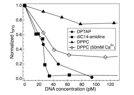 圖7(上圖)所示的壓縮等溫線清楚地表明,DNA對diC14氨基單層膜的影響,在很大的密度范圍內(nèi),是增加表面壓力,或等效地降低表面張力。也就是說,加入DNA后,表面生成的自由能總是變得更有利。然而,在沒有進一步信息的情況下,這些實驗幾乎無法深入了解表面熱力學變化的分子基礎(chǔ)。雙14-氨基單分子膜的CH區(qū)域的VSF光譜作為DNA濃度的函數(shù),以及由此產(chǎn)生的CH3SS/CH2 SS比率,提供了這樣的見解。如圖7(下圖)所示,向亞相添加DNA,即使在40 pM以下的體積濃度下,也會導致脂質(zhì)尾部順序的強烈增加。在解釋電子自旋共振研究的結(jié)果時,貝納蒂及其同事曾認為,吸附的DNA使凝膠相雙氰胺雙層(低于23°C)流態(tài)化,并使液相雙層(高于23°C)僵化,從而有效地平滑了在沒有DNA的情況下急劇的熱相變。91我們的光學和壓力等溫線測量都是在略低于熔融溫度的情況下進行的。我們的壓縮等溫線表明,DNA的作用是增加表面上單個鏈之間的相互作用(降低表面張力),而光學測量表明,鏈相互作用的增加導致脂質(zhì)尾部更有序。有趣的是,這些結(jié)果與這樣一種情況是一致的,即DNA的加入似乎會產(chǎn)生脂質(zhì),兩者之間的相互作用比沒有DNA時更強烈,尾巴比沒有DNA時更有序,鏈的流動性增強。這種脂鏈流動性和脂鏈順序的解耦類似于之前觀察到的膽固醇和DPPC混合物隨溫度變化的情況。92
