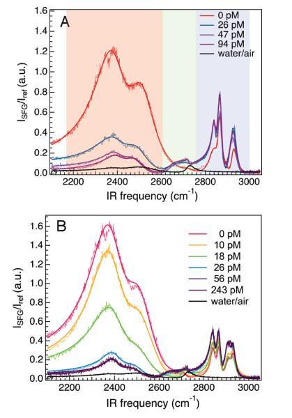界面水的光譜響應。圖2顯示了在2100-3100 cm-1范圍內(nèi),隨著亞相DNA濃度的增加,DPTAP、diC14氨基和DPPC單分子膜的VSF光譜。對這些數(shù)據(jù)的粗略檢查顯示出幾個特征。聚焦于圖2面板A,從低頻向高頻移動,很明顯,有一個巨大的雙峰結(jié)構(gòu),隨著DNA的加入,其振幅突然降低(透明的紅色矩形);一個小的、更高頻率的峰值(以≈2675 cm-1),隨著DNA(透明綠色矩形)的加入而增加;在2800-2950 cm-1的頻率范圍內(nèi)有幾個較窄的峰值(這些峰值是CH拉伸振動的結(jié)果,顯示在一個透明的藍色矩形中,下面將進一步討論)。