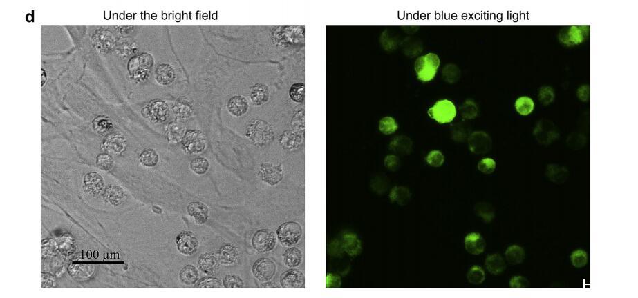 然后,我們進一步評估了基于體外共培養系統的細胞選擇性,該系統包含HL60癌細胞和HDFa原代細胞,它們與體內環境非常相似[8]。將最終濃度為20 mM的FITC-G(IIKK)3I-NH2添加到系統中,培養1 h后,用熒光顯微鏡觀察兩種細胞中的肽分布(圖1d)。很明顯,綠色熒光集中在懸浮和圓形HL60細胞中,而不是粘附和紡錘形HDFa細胞中,這再次表明肽具有良好的細胞選擇性,以及對癌細胞的快速識別。