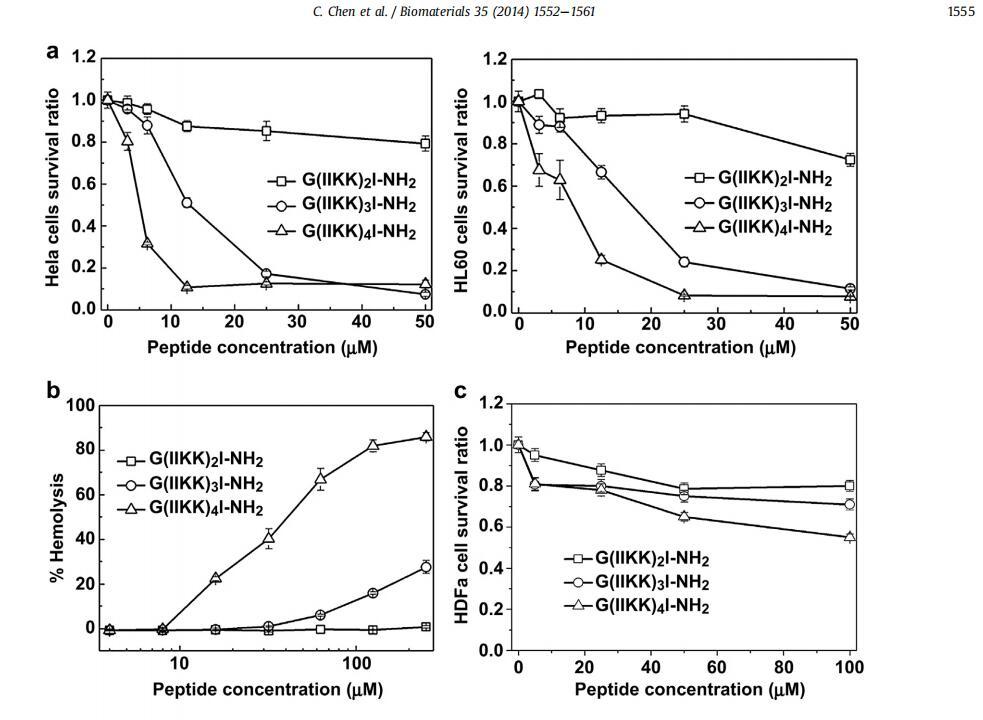 按照濃度依賴性模式,重復次數較多或長度較長的肽在殺死癌細胞(HeLa和HL60細胞)方面更有效,但對正常細胞(紅細胞和HDFa細胞)的體外毒性也開始增加,如圖1aec所示。總的來說,就體外抗癌活性和細胞選擇性而言,G(IIKK)3I-NH2是最佳序列,其對HeLa和HL60細胞的IC50值為15和25 mM,EC50遠大于250 mM(IC50:濃度導致50%的癌細胞生長抑制;EC50:濃度誘導50%的紅細胞溶解)。重要的是,HDFa細胞對這些肽有良好的耐受性,例如,在濃度低于50 mM時,G(IIKK)3I-NH2對HDFa細胞的影響微不足道(圖1c)。我們合理設計的短肽的這種性能明顯優于天然AMP,如馬蓋寧和蜂毒素,并且在有效性、選擇性甚至耐藥性方面也優于抗癌藥物順鉑[12e15]。例如,在類似的實驗條件下,magainin-2對HeLa細胞的IC50低于60 mM,而蜂毒肽在5 mM下的EC50則低得多,顯示出對宿主細胞的高毒性[12e14]。