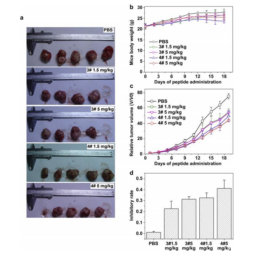將人宮頸癌HeLa細胞接種于裸鼠皮下。腫瘤植入5天后,分別以1.5 mg/kg和5 mg/kg的劑量腹腔注射肽G(IIKK)3INH2和G(IIKK)4I-NH2。在給藥期間,未觀察到任何毒性跡象,如體重減輕和外觀不良(圖6b),盡管G(IIKK)4I-NH2顯示出更高的體外溶血性。與PBS中的陰性對照相比,這兩種肽對腫瘤生長表現出明顯的抑制作用,其中G(IIKK)4I-NH2表現出比G(IIKK)3I-NH2更好的療效(圖6c),這與它們的體外抗腫瘤趨勢一致。18天后,解剖腫瘤并稱重(圖6a和d)。在1.5 mg/kg和5 mg/kg劑量下,G(IIKK)3I-NH2治療組的腫瘤生長抑制率分別為0.23和0.31。G(IIKK)4I-NH2能產生更有效的抑制作用,在1.5 mg/kg和5 mg/kg劑量下,抑制率分別為0.32和0.41。這些數據表明,在小鼠異種移植模型中,螺旋肽可以有效地抑制腫瘤生長,而腫瘤細胞不能被完全清除。許多抗腫瘤藥物的不完全抑制作用已被廣泛觀察到,這可歸因于多種機制,例如藥物從腫瘤部位相對較快地清除,以及它們難以通過壞死區域擴散[42],但目前這組肽背后的確切原因有待進一步的機理研究。
