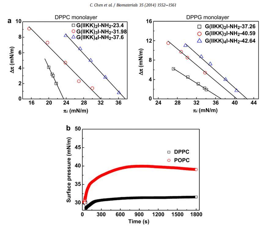 圖2。肽與不同脂質單層的相互作用。(a)當肽以3 mM濃度注入亞相時,在不同初始表面壓力(pi)下,DPPC和DPPG單分子膜的表面壓力增加(Dp)。(b)將G(IIKK)3I-NH2注入DPPC和POPC單分子膜的亞相后的表面壓力與時間的關系。