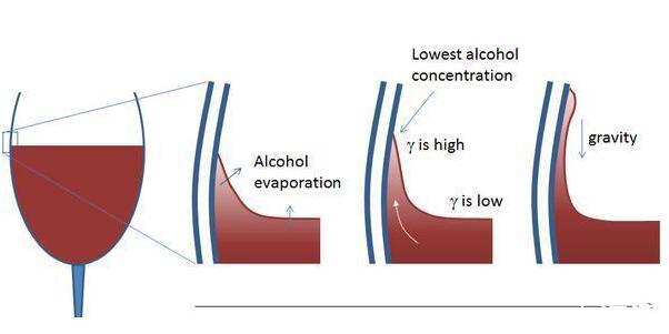 瑪拉高尼效應(yīng)不光存在于物理實驗和我們之前開的玩笑之中,在我們的日常生活中也有馬拉高尼效應(yīng)的體現(xiàn),這一現(xiàn)象可能每一個人都見過,那么就是我們在喝酒的過程中看到的所謂的好酒會掛壁的現(xiàn)象。就算再好的酒,它也是有水在其中的。好酒中的酒精由于毛細效應(yīng)爬到高處的時候,酒精蒸發(fā),使得處于上層的酒液的酒精含量相比較于下層來說要低,而同時的酒的表面張力要比水小,兩種液體表面張力的差距就形成了馬拉高尼效應(yīng)。