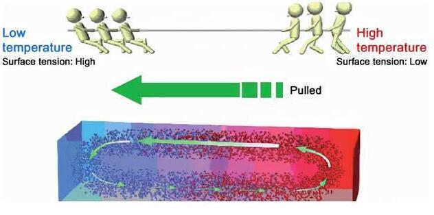 在兩種液體相互接觸的時候,表面張力強的液體會將表面張力弱的液體拉過來,這股力會將表面張力弱的液體反向倒吸進表面張力強的液體之中,科學家將這一現(xiàn)象命名為馬拉高尼效應(yīng)。導致這一現(xiàn)象發(fā)生的條件有很多,比如液體的濃度含量,溫度的高低都會讓兩種液體產(chǎn)生馬拉高尼效應(yīng)。