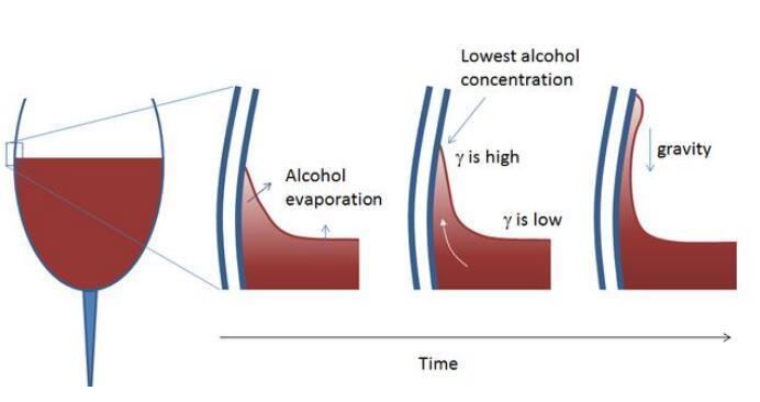 水由于強有力的氫鍵的存在,使得其表面張力極強。正是由于表面張力的存在,因此葡萄酒和杯壁交界處有一個薄薄的彎月面,它的存在加上表面乙醇的蒸發,使得此處水的占比較大,因此具有較大的表面張力。而酒內部的乙醇濃度較高,表面張力較小,因此與彎月面處形成了一個表面張力梯度,從而內部的酒逐漸向彎月面移動,彎月面處的酒逐漸變多,逐步形成一個個小酒滴。但當酒滴大到一定程度時,由于重力作用,它便會滴下來,這就是“酒淚”現象了。
