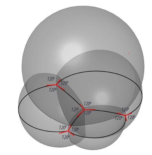 現(xiàn)在我們知道了表面張力決定泡泡的連接方式,泡沫總會找到一種具有最小表面張力的結(jié)構(gòu),也就是使總表面積最小的結(jié)構(gòu)。但是,關(guān)于泡沫的結(jié)構(gòu)還需要考慮另一個問題,即力學上的穩(wěn)定。在連接點處,沿著不同方向的作用力必須達到平衡。無論是泡泡筏的平鋪還是泡泡堆的四面相連,都是能滿足這一要求的連接方式。