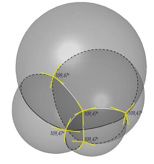 如果我們從平面的泡泡筏推演到立體的“泡泡堆”,結(jié)果也是類似的。假如你用吸管對著一碗肥皂水吹氣,吹起一堆泡沫,你會看到,當泡泡堆積在一起之后,它們四面邊界相交于一個點,夾角約為109°——沒錯,這個角度就是正四面體中心到各頂點連線的夾角。