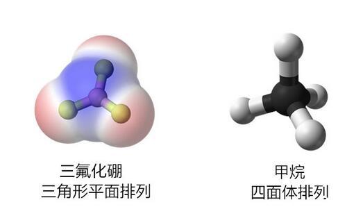 前節(jié)介紹了氯氣分子和二氧化碳分子,它們都是非極性的。對于由更多原子組成的一些分子,由于組合幾何結構的關系,它們也往往對外顯示出極性或非極性。比如三角形平面排列的三氟化硼和四面體排列的甲烷,它們都是非極性分子,因此不會產(chǎn)生整體偶極子。