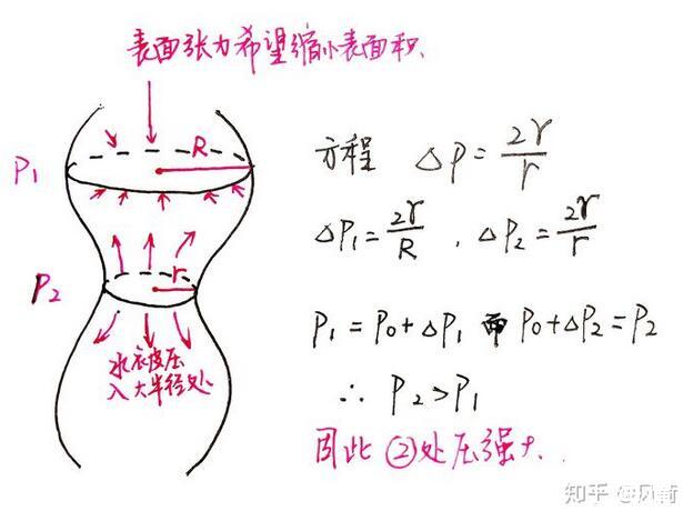 表面張力會像皮筋一樣收縮液體的表面積,同時(shí)壓力大(半徑小)的地方的水被擠到半徑大的地方,使得本來細(xì)的地方半徑變得更小。