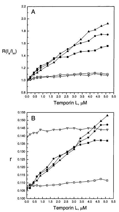 圖5:通過芘標(biāo)記的磷脂PPDPC(X)0.01)的熒光和DPH(X)0.002的穩(wěn)態(tài)發(fā)射各向異性r評估顳葉素L對LUV中脂質(zhì)動力學(xué)的影響,顯示為含XPOPG)0(0)、0.10(9)、0.20(B)和0.40(2)的SOPC脂質(zhì)體中歸一化準(zhǔn)分子與單體比率r(Ie/Im)(圖A)和各向異性r(圖B)的變化,Xchol)0.10(3)。每個數(shù)據(jù)點代表三次測量的平均值。標(biāo)準(zhǔn)偏差小于0.02(面板A)和0.004(面板B),為清楚起見,未顯示。否則情況如圖2圖例所示。