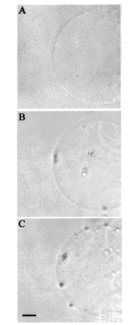 時間蛋白對膜拓?fù)浣Y(jié)構(gòu)的影響。巨大脂質(zhì)體是生物膜的優(yōu)秀模型,因為其尺寸與細(xì)胞相當(dāng)。此外,它們可以通過光學(xué)顯微鏡進(jìn)行觀察(15,21)。我們之前對馬加寧2和吲哚肽的研究表明,這些肽對巨大脂質(zhì)體膜的拓?fù)浣Y(jié)構(gòu)有顯著影響(15)。在本研究中,在類似條件下,通過顯微鏡觀察了在巨大囊泡外表面添加這些肽后,temporins對巨大脂質(zhì)體三維拓?fù)浣Y(jié)構(gòu)的影響。SOPC巨脂質(zhì)體即使暴露于大量該肽(約1.2 fmol的temporin B)(每個重復(fù)100份12 amol)時,也不受temporin B的影響。同樣,含有膽固醇(Xchol)0.10)的巨大囊泡也不受該量的顳葉素B的影響。然而,在將該肽添加到SOPC和SOPC/膽固醇(Xchol)0.10)巨大脂質(zhì)體的表面時,偶爾會觀察到相鄰囊泡之間的粘附(數(shù)據(jù)未顯示)。然而,在POPG(XPOPG)0.10的存在下,已經(jīng)≈36 amol(10-18 M)的顳葉素B(約60 fL,3次注射)施加在巨大囊泡表面上,引起巨大囊泡膜拓?fù)浣Y(jié)構(gòu)的顯著變化(圖6,面板B)。具體來說,小顆粒(φ≈10μm),然后進(jìn)入巨大脂質(zhì)體的內(nèi)腔(圖6,面板B)。進(jìn)一步增加≈0.24 fmol的顳蛋白B(約400 fL,20次注射)導(dǎo)致巨大囊泡內(nèi)這些顆粒的數(shù)量增加(圖6,面板C)。還觀察到巨大囊泡表面的顆粒聚集(圖6,面板C)。隨后,在≈10分鐘后,將顆粒轉(zhuǎn)移到巨大脂質(zhì)體的內(nèi)腔中。