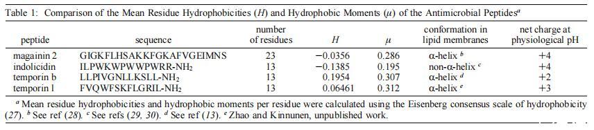 我們的長期目標(biāo)是建立最低的序列要求,這可以進(jìn)一步作為設(shè)計新型抗菌肽類似物的指導(dǎo)原則。我們之前已經(jīng)比較了兩種抗菌肽,馬蓋寧2和吲哚肽對本研究中使用的相同模型膜系統(tǒng)的影響,即。,單層、脂質(zhì)體和巨大囊泡(15)。我們早期研究中使用的肽是選擇的,因為它們代表兩種不同類型的抗菌肽家族。在本研究中,我們使用了兩種13個氨基酸的肽,即與吲哚肽長度相似的肽。肽的結(jié)構(gòu)參數(shù)不同,如電荷、構(gòu)象、疏水性、疏水力矩和大小(表1)。有趣的是,在所研究的四種肽中,以摩爾為基礎(chǔ)計算的時間蛋白L最有效,作用于中性和酸性磷脂膜。與其他三種肽相比,其凈陽離子電荷和疏水性具有平均值(表1)。然而,在所示的肽中,temporin L具有最高的平均疏水力矩,這表明這可能是與其有效的膜擾動作用相關(guān)的一個重要參數(shù),這與之前比較magainin 2和其他抗菌肽的研究一致(31)。