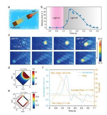 研究人員研制的驅(qū)動(dòng)薄膜中具有光熱效應(yīng)極好的氧化石墨烯(GO)材料,可將光能轉(zhuǎn)換成熱能,當(dāng)光照射漂浮于水面上的驅(qū)動(dòng)薄膜時(shí),薄膜會(huì)產(chǎn)生一定的溫度并傳遞給周圍的液體,造成局部水溫升高進(jìn)而影響水的表面張力。