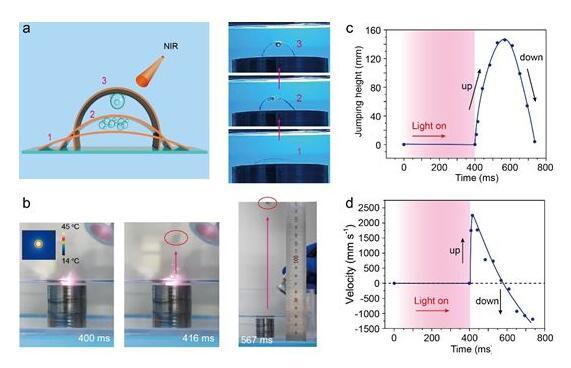 光刺激下驅(qū)動(dòng)器可以在極短的響應(yīng)時(shí)間(400 ms)內(nèi)從液體介質(zhì)跳越到空氣中,最高速度為2 m/s,高度可達(dá)14.3 cm。