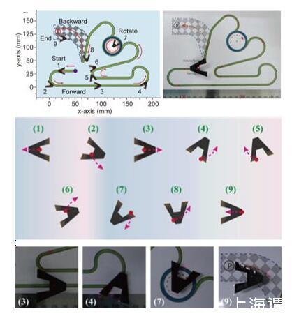 通過(guò)實(shí)驗(yàn)探索發(fā)現(xiàn)三角形的驅(qū)動(dòng)薄膜在光照射底邊可以很快游動(dòng),但卻存在方向性不可控的缺陷。要使其可完成液面直線游動(dòng)、轉(zhuǎn)彎、自旋轉(zhuǎn)等操作,三角形薄膜顯然難以辦到。