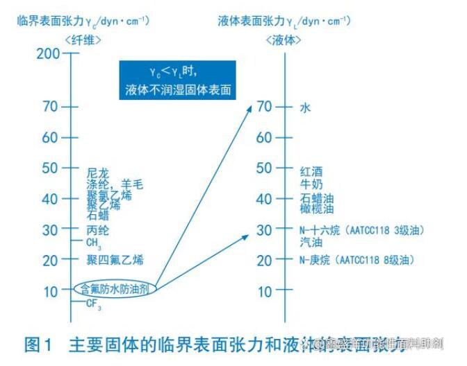 圖2中展示了,含氟防水防油劑通過(guò)降低纖維表面張力,達(dá)到優(yōu)異的防水防油效果。如通常棉的臨界表面張力為γc≈200 mN/m,而常溫下水、果汁、油的表面張力分別為72、50、30mN/m,所以棉很容易被以上液體潤(rùn)濕。經(jīng)過(guò)含氟整理劑處理后,棉纖維表面張力下降至約10 mN/m,呈現(xiàn)出良好的防水防油性。而無(wú)氟防水劑本身的表面張力比較高,只能防水或者防部分水溶性液體(如牛奶、果汁等),達(dá)不到防油的效果。