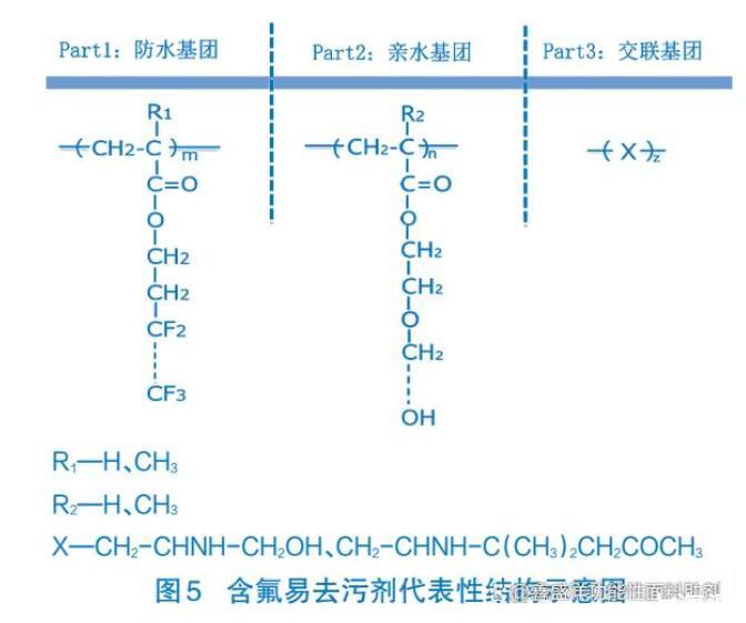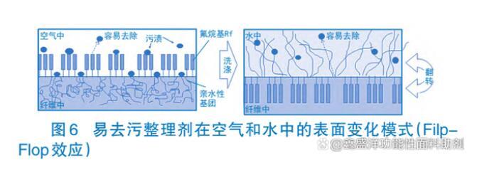 圖5為含氟易去污劑的主要結(jié)構(gòu)含氟易去污整理劑分子中既含有防水防油基團(tuán)——全氟烷基丙烯酸酯聚合物,又含有親水基團(tuán)——聚氧乙烯鏈等。織物經(jīng)整理后全氟烷基鏈段定向排列在纖維表面,排斥水性和油性污物,使其不易沾污。如果織物被污物沾附,在水洗液洗滌時(shí),親水性鏈段定向排列在纖維與液體的界面上,吸引水分子,提高其易去污性能(也叫Filp-Flop,反轉(zhuǎn)凈洗效應(yīng))。織物水洗后烘干,親水鏈段脫水,氟烷鏈段重回其主導(dǎo)地位,再度呈現(xiàn)良好的防水防油性能。
