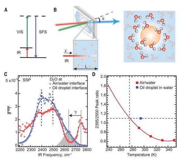 氫的疏水性代表了一種基本的物理性質,它決定了水介質中的各種過程,如蛋白質折疊、自組裝和聚集。亞微米級疏水油滴或水微粒是了解疏水作用機理的重要模型系統。然而,這些界面的電荷和結構都有很大的爭議。雖然電荷轉移模型表明水是油滴電荷存在的關鍵,但油滴旁邊的水的結構同樣存在爭議。因此,疏水液體材料旁邊的水的結構仍然是未知的。